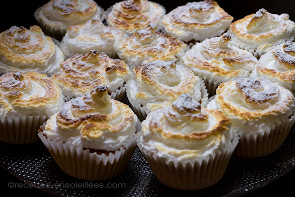 Décorez vos cupcakes avec cette meringues et passez 5 secondes (+ ou -) sous la grille du four préchauffé à 250° C (si comme moi, vous n’avez pas de chalumeau).